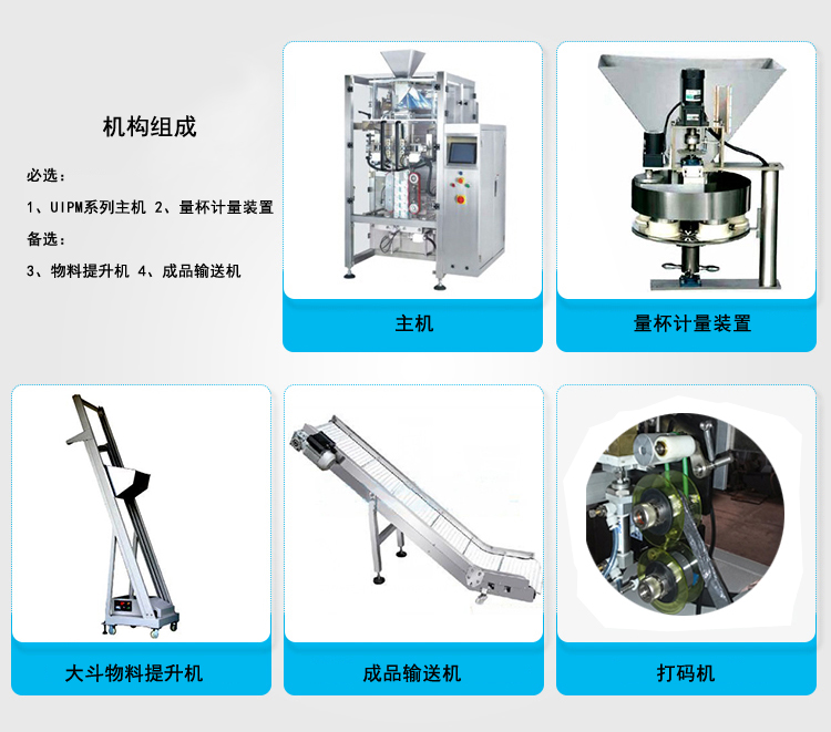 1.自动完成产品输送、计量、充填制袋、打印日期、成品输出的全部自动过程;