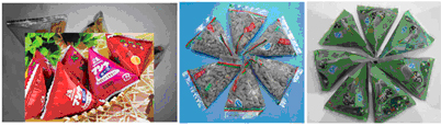 Adopting electrical eye control system, every package can be cut apart accuracy. Finished product shape is triangle, new original and unique. With independent hopper for feeding, it can feed several kinds materials in one bag. |